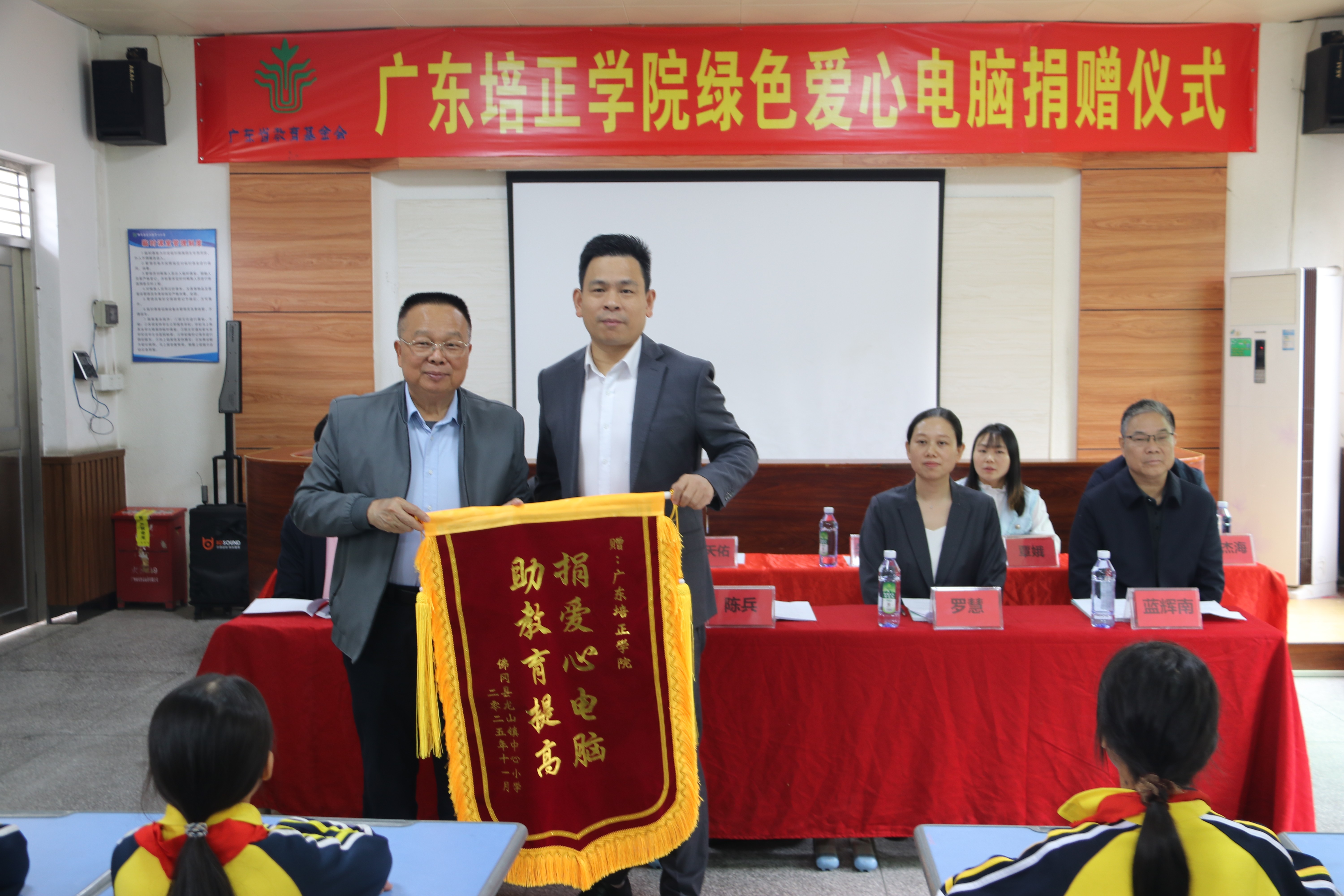 廣東培正學院黨辦主任陳兵、基建與資產(chǎn)管理處職員羅慧,廣東省教育基金會副秘書長謝紹熺,佛岡縣教育局黨組成員、教育系統(tǒng)黨委專職副書記藍輝南,龍山鎮(zhèn)人民政府教育專干黃丹妮,佛岡縣教育慈善會會長朱龍騰、秘書長鄭建國、原秘書長胡天佑,深圳八方園通信息技術服務有限公司慈善項目負責人覃娥,佛岡縣龍山鎮(zhèn)中心小學黨委書記黃杰海、校長徐金流,龍山鎮(zhèn)中心小學師生代表參加了捐贈儀式。